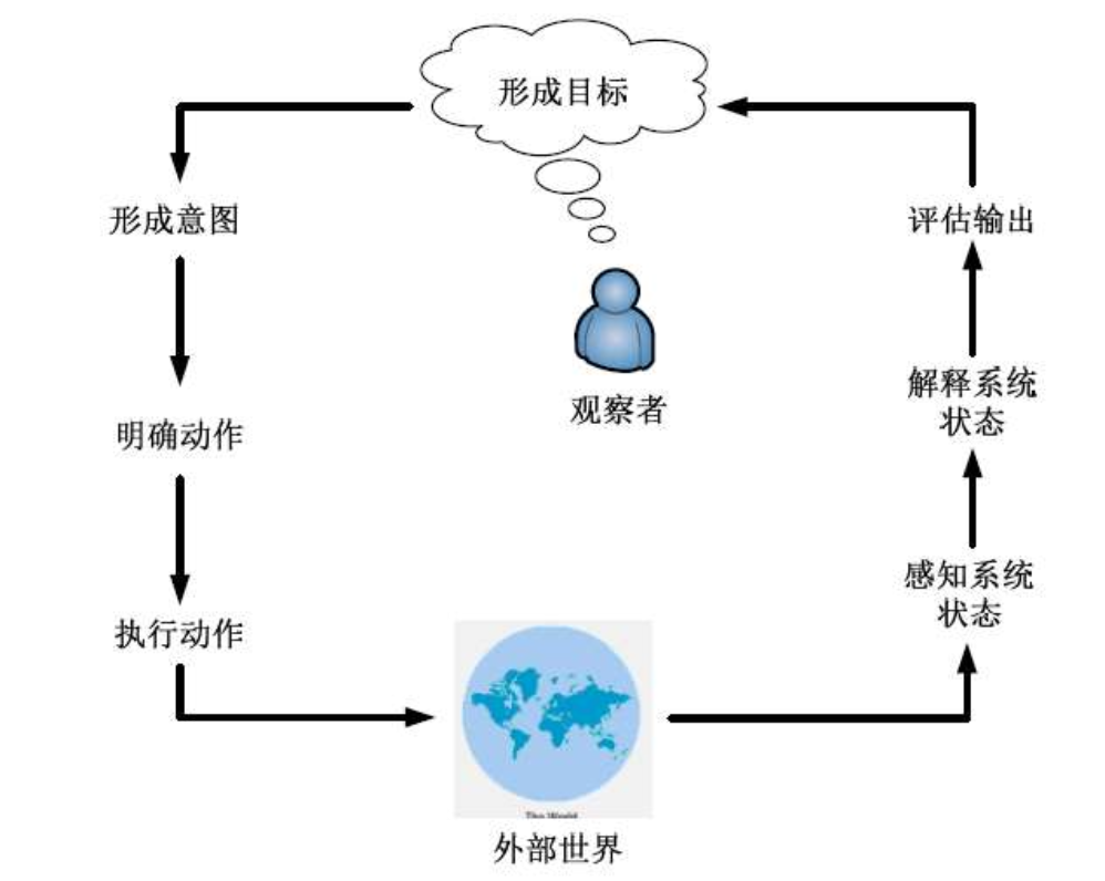 这一模型共有两个阶段:执行阶段和评估阶段。上图左侧代表执行阶段,而右侧代表评估阶段。每个循环代表着一个动作。