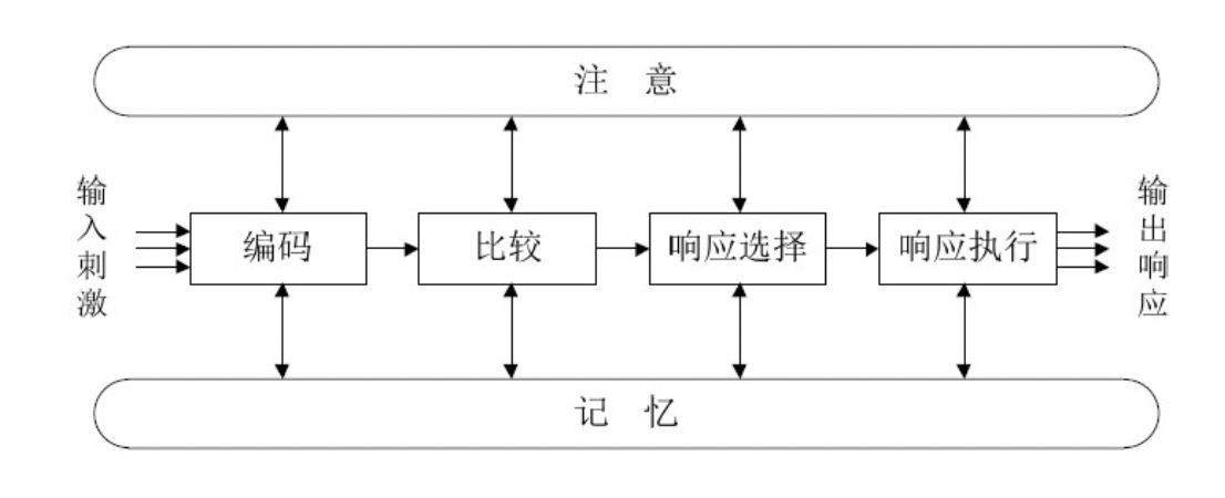 - 信息处理机模型:包括输入、编码、比较、响应选择、响应执行、输出等过程。一个扩展是:引入了注意和记忆功能,它们与信息处理的各个阶段均存在着交互。