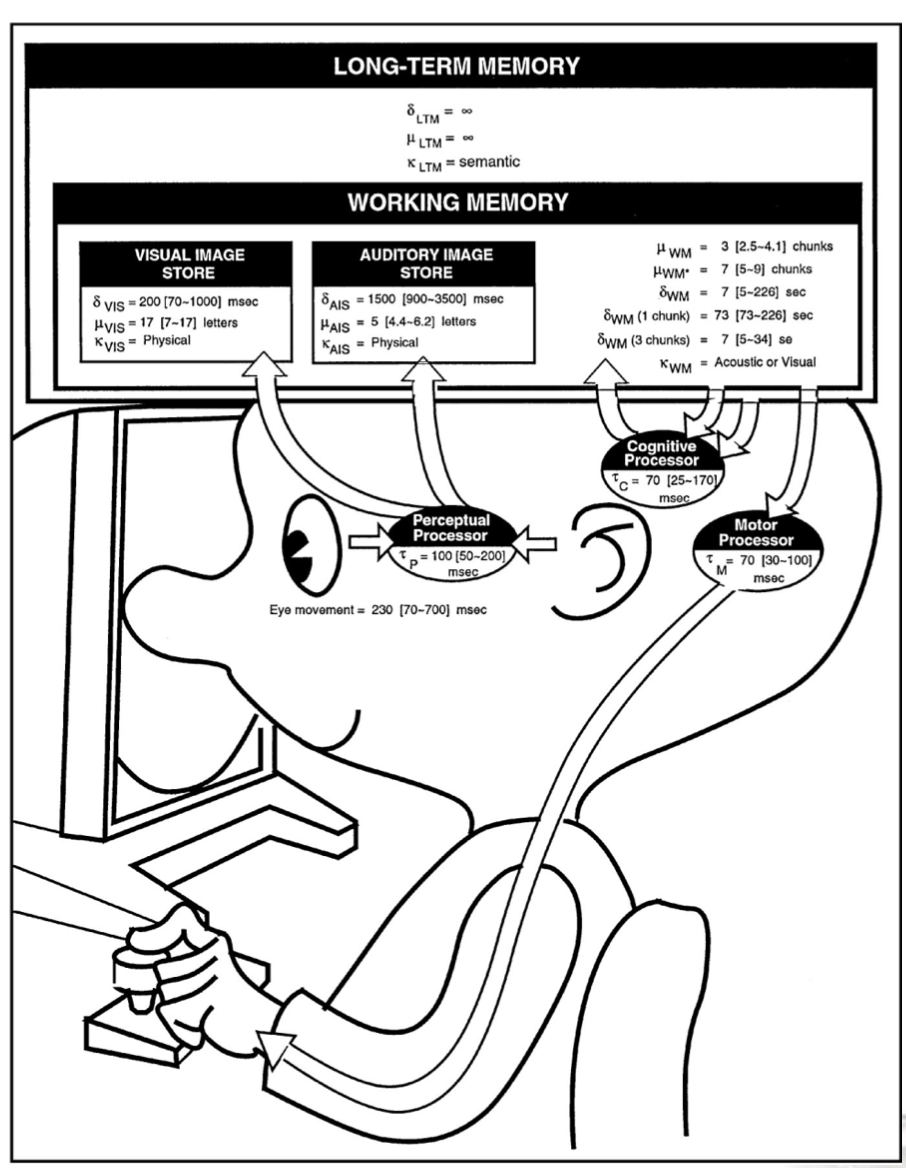 - 人类处理机模型:是最著名的信息处理模型。包含三个交互式组件:感知处理器(类似传感器,将外界信息处理后输出到位于工作记忆的相应“音频”和“视频”存放区)、认知处理器(根据长期记忆和工作记忆进行处理,再将结果输出到工作记忆中)和动作处理器(用于执行任务)。这一模型之所以经典且重要,是因为它基于一系列认知实验数据,所以成为了后面很多工作的基础。