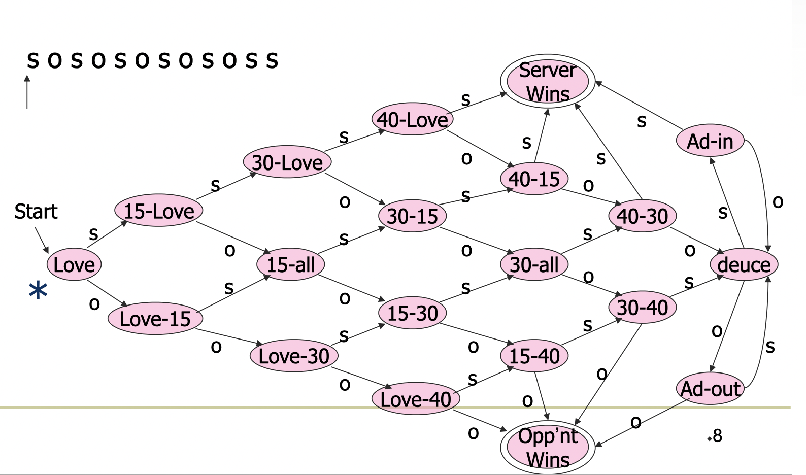 We can model the game of tennis as a finite automaton. The input to the automaton is the sequence of points won by the two players, we name the input alphabet as