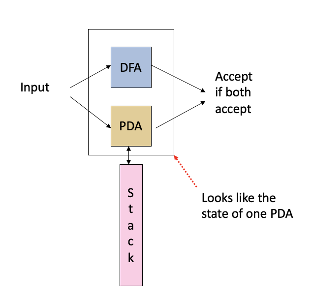 However, A CFL is closed under intersection with a regular language. The proof is simple. We can imagine a DFA and PDA running in parallel. But from the outside, the multiple machines can be regarded as only a single PDA.