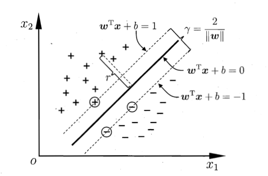 我们先来考虑一个感知机的问题。如何寻找一个能将数据集分成两类的超平面?对于线性可分的数据集,可能有很多很多选择。那么,我们应该如何选择一个“最好的”、泛化能力最强的超平面呢?我们可能会想到前文的线性判别分析,但这一算法不能将数据集完全分开。直觉告诉我们,我们应该选择一个在两类样本正中间的超平面。这个超平面距离两类样本的最近点的距离最远。的确,这一算法在实际的模型中表现较好,并且如果利用核函数,该算法还适用于线性不可分的情况。有了这一直观的感受的基础,我们就给出下面的定义: