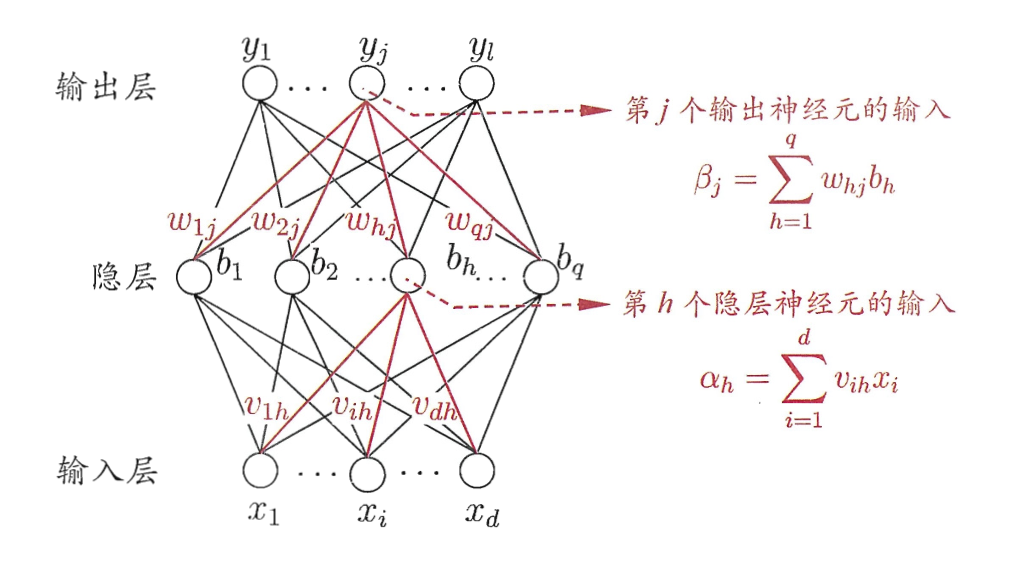 是网络在 样本下的第 个输出神经元的输出; 是输出层第 个输出神经元的阈值; 是输出层的输入和权重的线性组合结果; 是隐藏层到输出层的权重; 是隐藏层的输出,也是输出层的输入; 是隐藏层第 个神经元的阈值; 是隐藏层的输入和权重的线性组合结果; 是输入层到隐藏层的权重; 是输入层的输入;