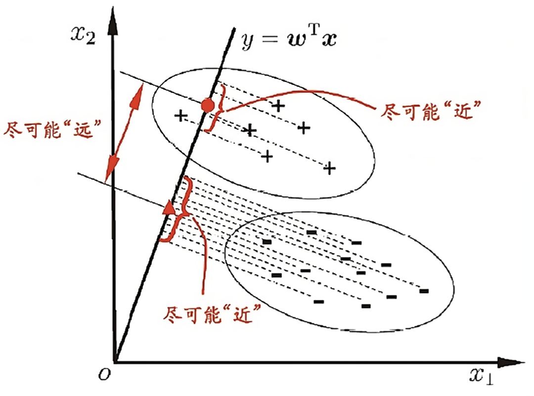 尽可能小; - 异类样例的投影点尽可能远离,即