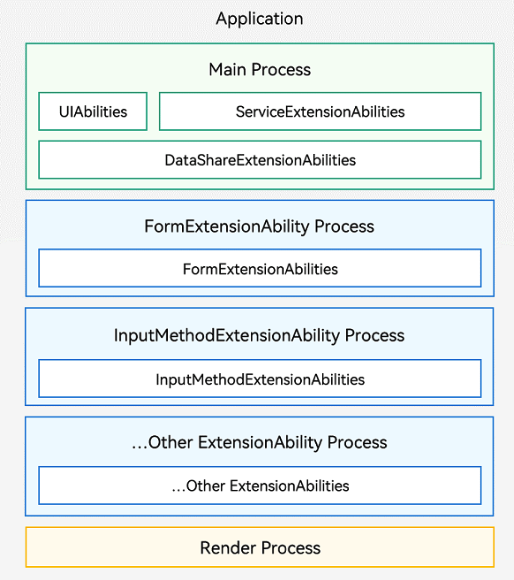 ExtensionAbility均是各自运行在一个独立进程中,如下图中蓝色部分的 “FormExtensionAbility Process”、“InputMethodExtensionAbility Process”、其他ExtensionAbility Process。 - WebView:
