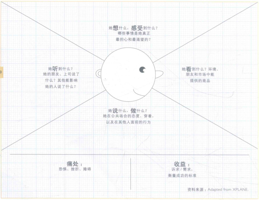 | 想法 & 感受 | 用户思维的过程(最关注的问题;不公开承认的忧虑、期望) |